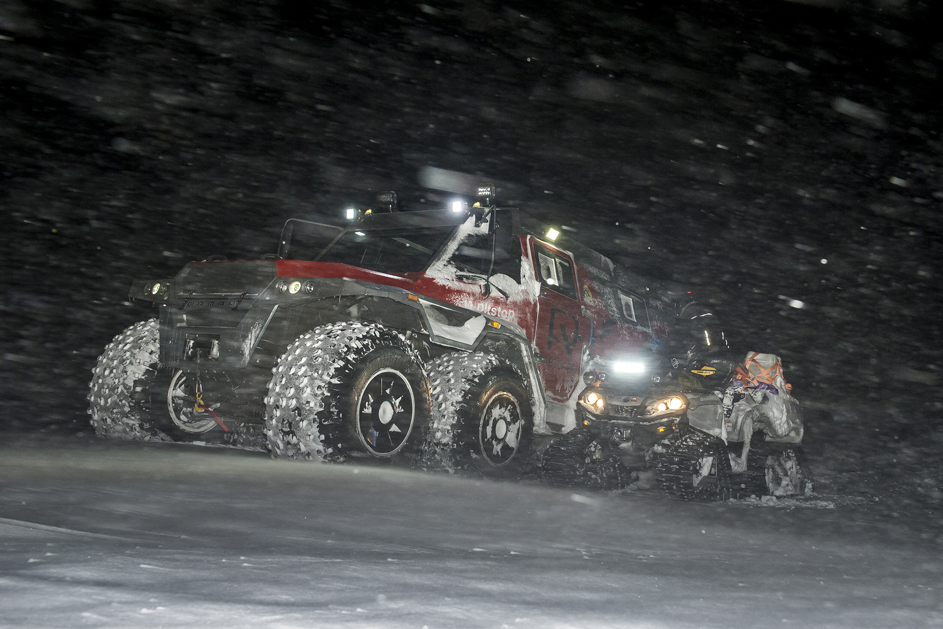 The first hundred kilometers we traveled in a strong snowstorm, snow swept the road and covered the windshield, the wipers were freezing, but after Bezhetsk the weather improved. In Vologda Region, the roads were covered with ice, but all-terrain vehicles rode along them quite confidently, thanks to the the weight of the cars and the number of wheels. The motorcade was headed by Pavlov’s “tadpole”, followed by a crew of mechanics, and a crew of journalists closed a small motorcade. We were driving together, although not fast: cruising speed was about 55-60 km /h. There were still more than 1,000 km ahead - the expedition was still at the very beginning.