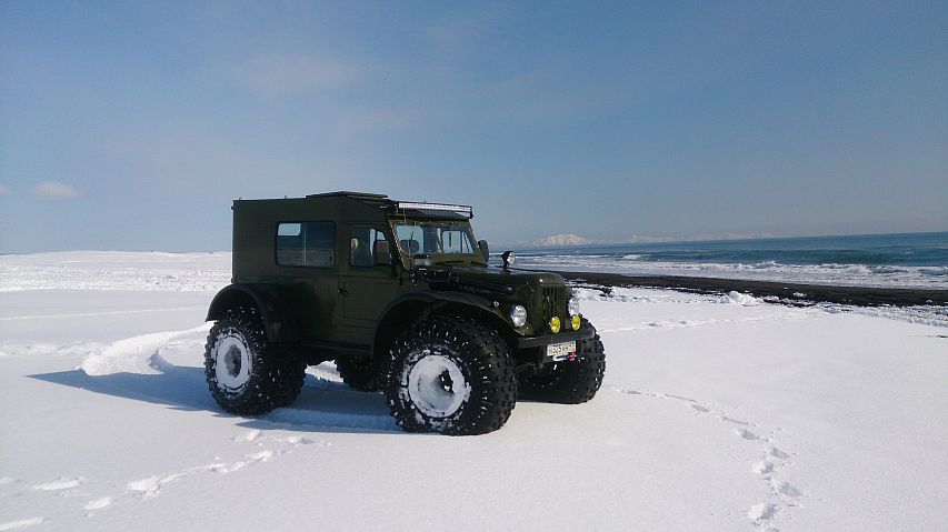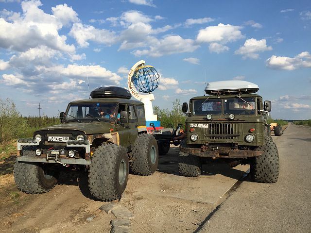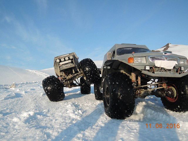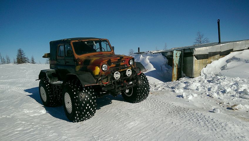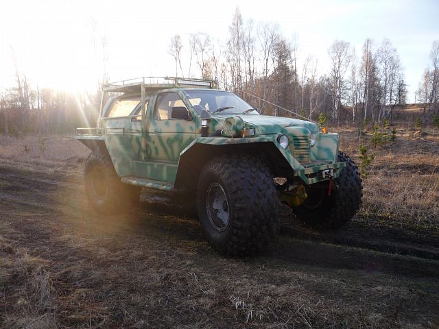 Машина получилась на все сто. Резина пока радует испытал по лесу идет хорошо, по болоту просто король идет как по полю, и по грязи нет равных он ее только прикатывает. Вес машины от 2-х до 2200 тонн, ширина 2500, высота 2400 двигатель дизель т.д 27 коробка от грузовик атлас раздатка газ 66 мосты газ 66.